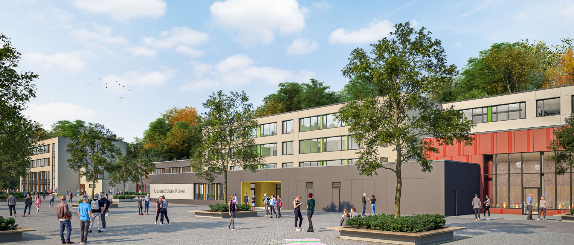 sowie den Neubau einer Sporthalle durch. Die im Abschluss zusammenstehenden Gebäude werden durch eine 3-seitige Arkade umfasst. Teilweise werden die Arbeiten im laufenden Schulbetrieb an der Gesamtschule Kürten durchgeführt.
