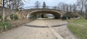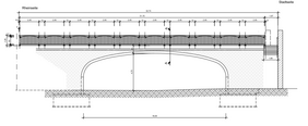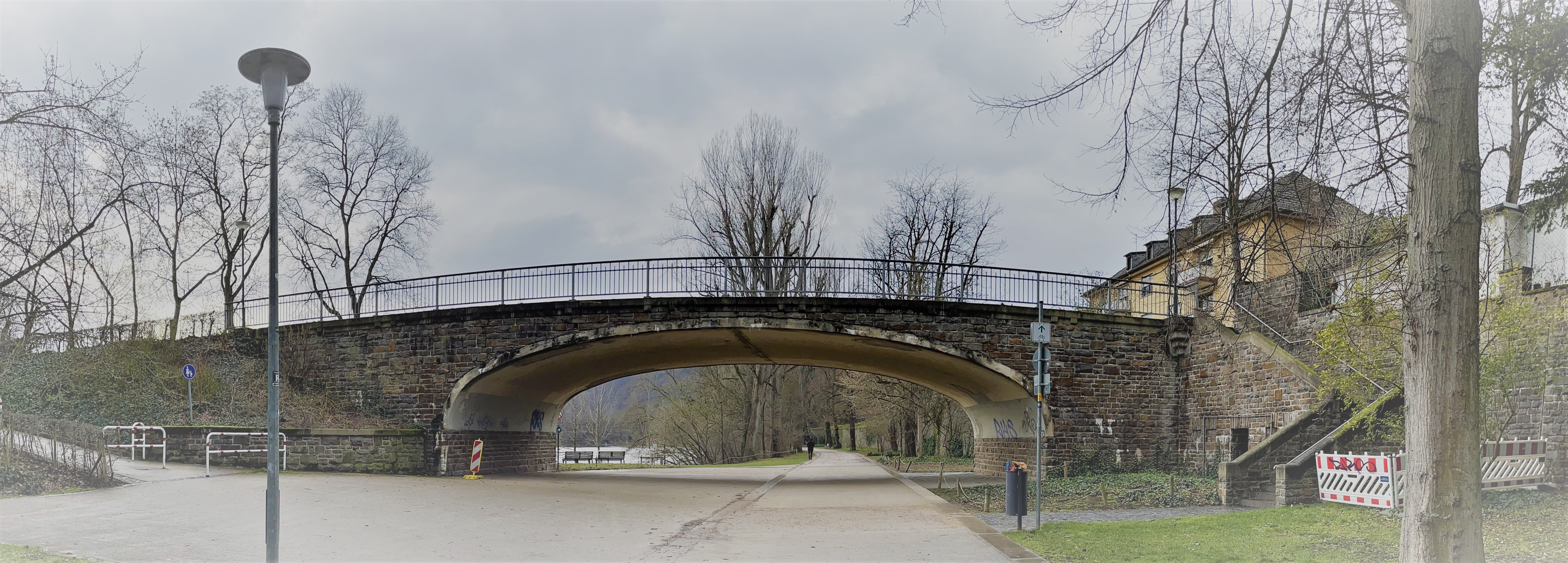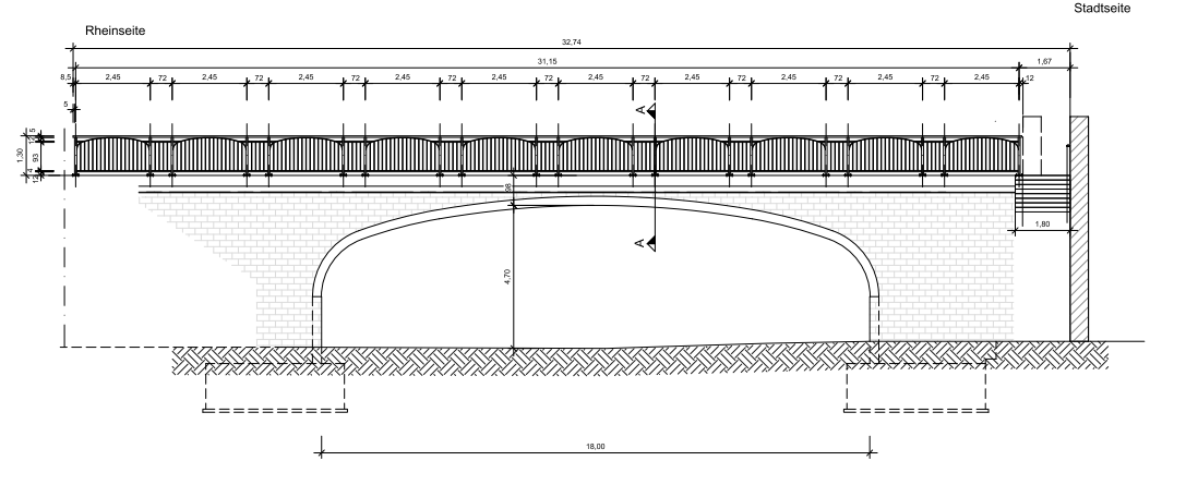 Für die Stadt Trier sollen wir ein optisch möglichst gleiches Bauwerk erstellen. Das Hauptgestaltungsmerkmal ist die Bogenform des 5-teiligen Korbbogens der Brückenuntersicht. Hinzu kommt die Natursteinverblendung der Ansichtsflächen mit Grauwacke als unregelmäßiges Schichtenmauerwerk. Bedingt durch die Herstellung des neuen Brückenbauwerkes wird auch die vorhandene Treppenanlage erneuert.