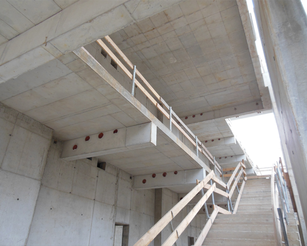 Der Neubau bildet den Auftakt der Neuerschließung dieses innerstädtischen Areals. Der Gebäudekomplex, der vier Gerichte zu einer Einheit zusammenfasst, besteht aus sechs zusammenhängenden Baukörpern, die eine höhengestaffelte Mäanderstruktur nachzeichnen und drei Höfe umschließen. Einer dieser Höfe ist das überdachte, viergeschossige Atrium, das Zentrum der Anlage und Herz des Saaltraktes. Eine großzügige Freitreppe markiert den Eingang und führt die Besucher direkt in das Atrium, das sich großzügig zum Garten öffnet. Über ein gläsernes Sheddach belichtet, wird es in den Obergeschossen U-förmig von den Gerichtssälen begrenzt. Eine offene Struktur aus Galerien, Freitreppen und Wartezonen erschließt die Säle.