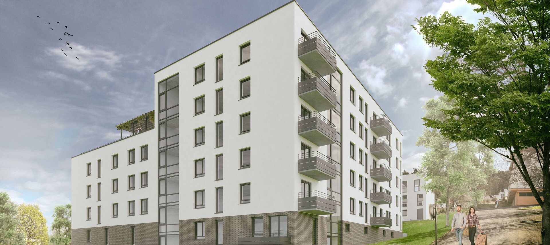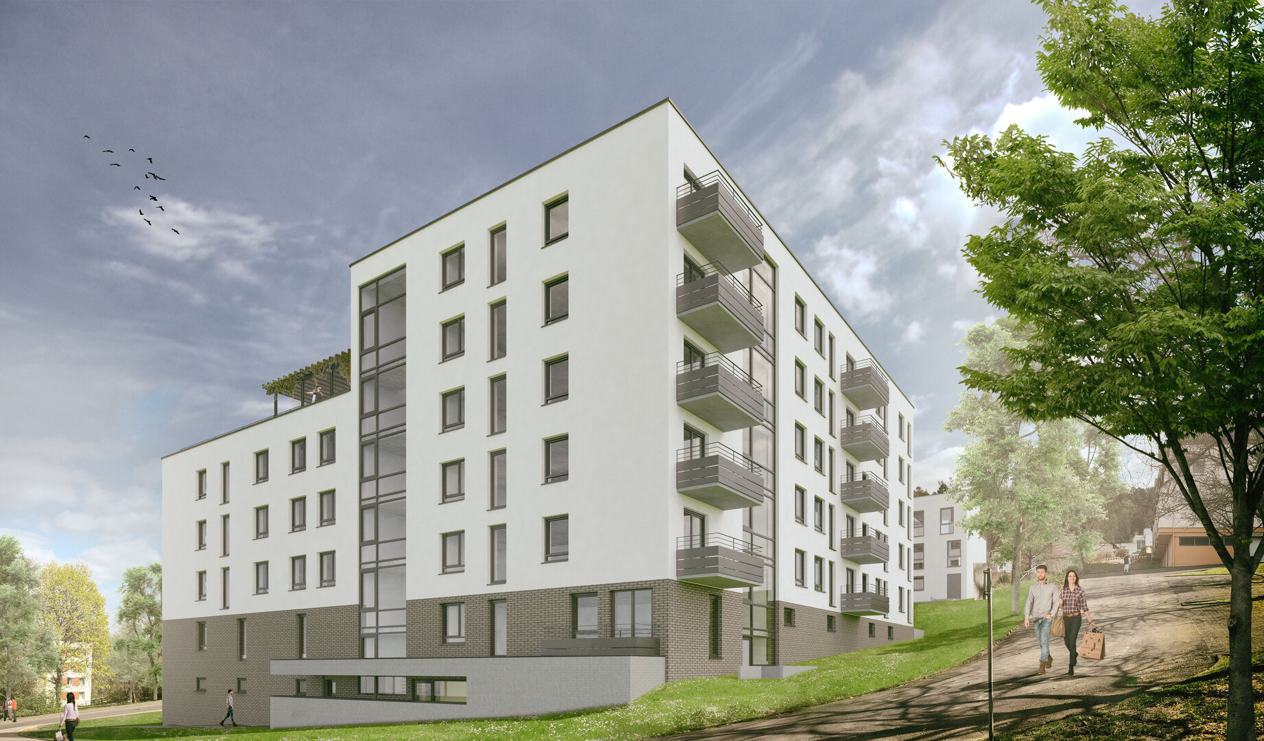 Der 6-geschossige Teil befindet sich am höchsten Punkt des Hanges, danach folgt rechtwinklig der 4-geschossige Baukörper. Die Basis bildete die Tiefgarage, welche sich im Nordwesten in den Hang eingräbt.