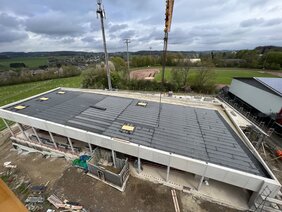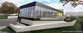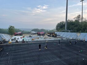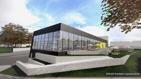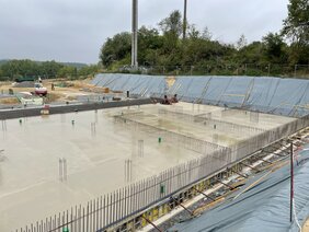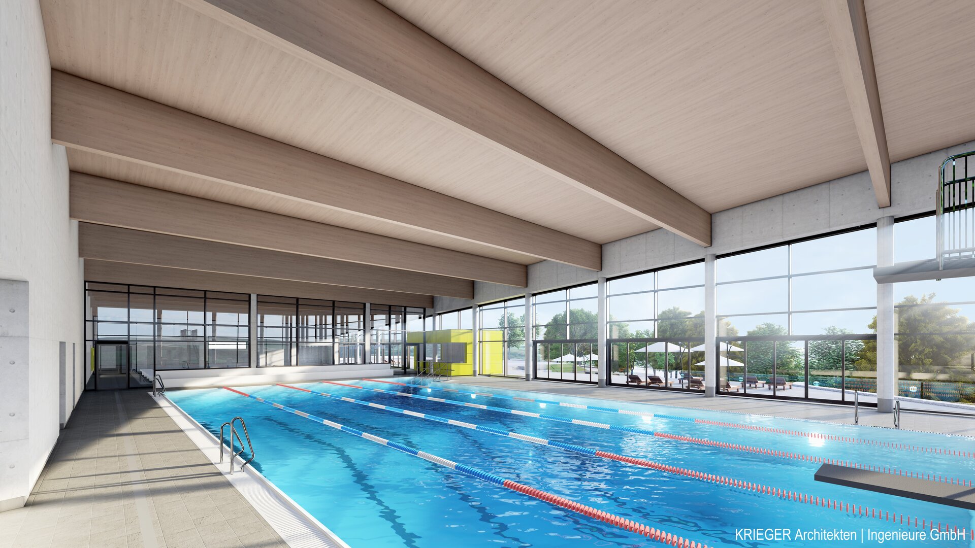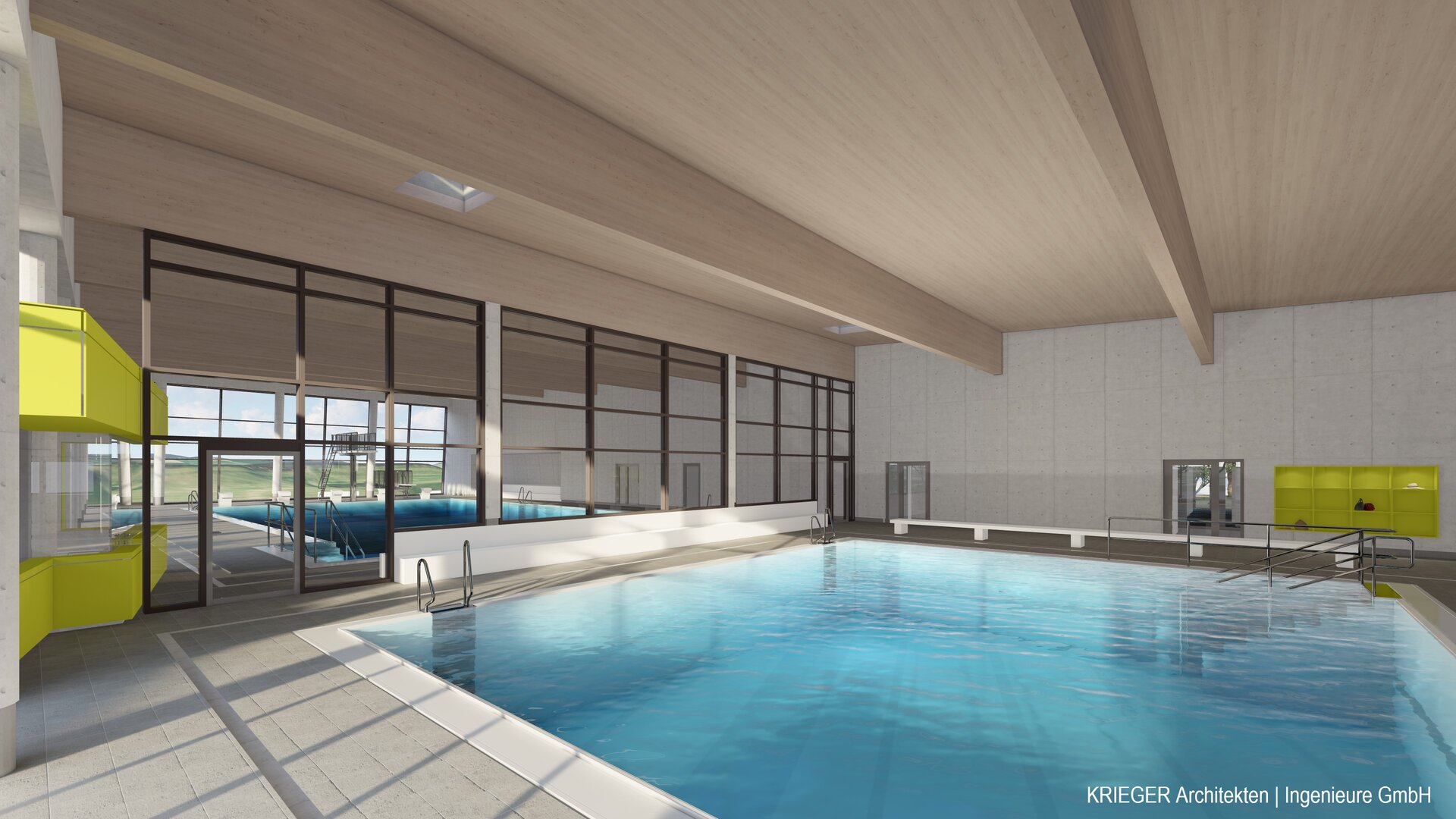 Hier entsteht der Neubau eines modernen Hallenbad mit einem 25m Sportbecken, einem Vario/Kursbecken mit Hubboden und einem Kinderplantschbecken, Betonkernaktivierung als Fussbodenheizung.