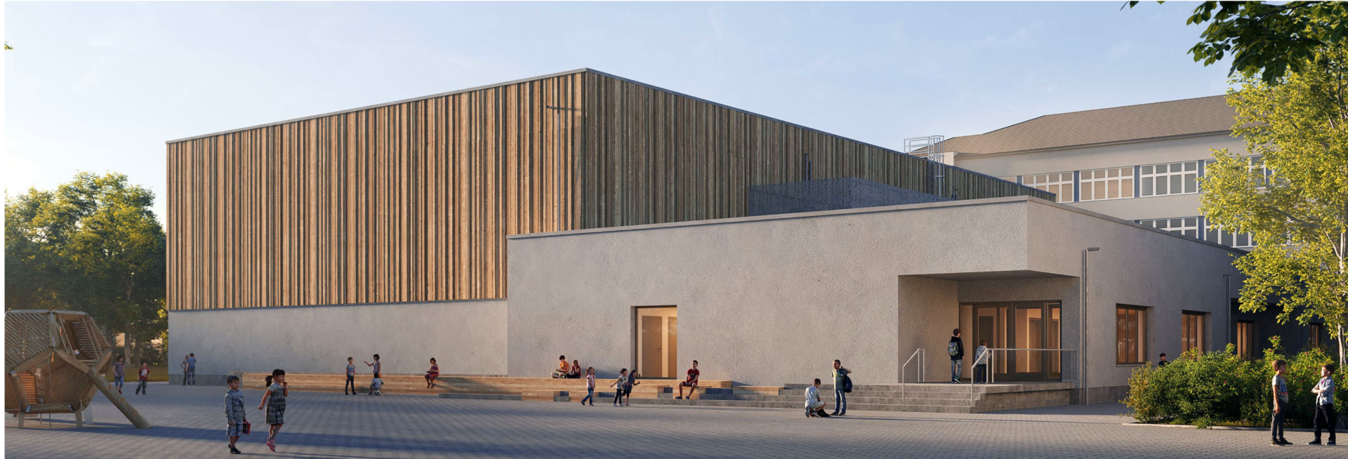 Es besteht aus der eigentlichen Halle, die mittels Trennwänden in drei Bereiche geteilt werden kann, sowie westlich angrenzend, einem niedrigeren Nebengebäudetrakt, der die Umkleide- Sanitär- und Serviceräume enthält. Das Nebengebäude wir in Mauerwerk auf der Bodenplatte errichtet. Über dem Mauerwerk schließt eine Stahlbetondecke den Baukörper nach oben ab.
