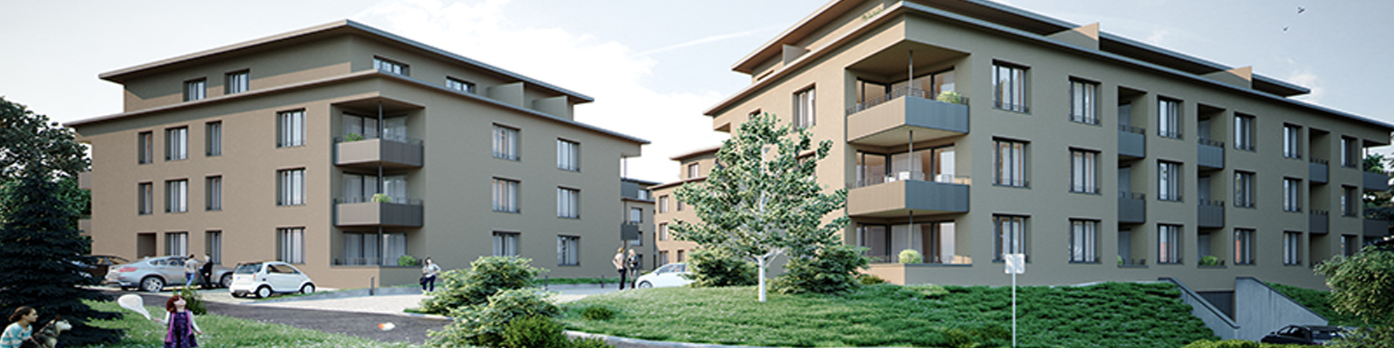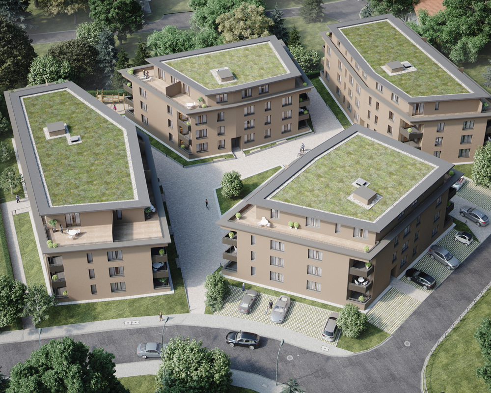 Bei diesem Bauvorhaben wurden die 4 Mehrfamilienhäuser auf einer durchgängigen Tiefgarage als KfW-Effizienhaus 55 mit ca. 6.277 m² Wohnfläche errichtet.